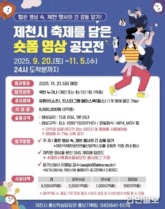 한민일보 서울포커스 김다남 기자 | 제천시가 오는 11월 21일까지 '제천시 축제를 담은 숏폼 영상 공모전'을 개최한다.