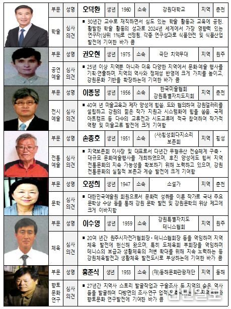 한민일보 서울포커스 곽중희 기자 | 강원특별자치도는 강원문화 발전과 향토문화 보존·증진에 기여한 유공자를 시상하기 위해 '제67회 강원특별자치도 문화상 심사위원회'를 개최하고, 7개 부문 7명의 수상자를 최종 확정했다고 밝혔다.