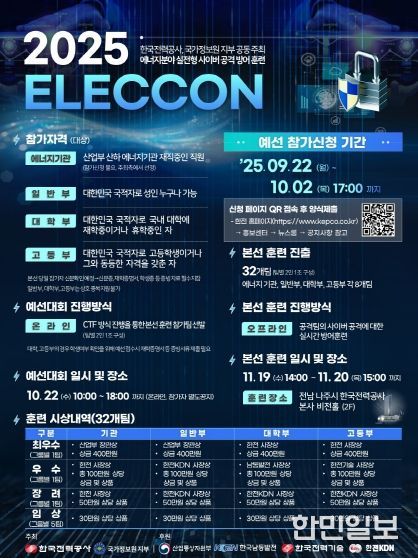 한민일보 서울포커스 임철현 기자 | 한국전력(대표이사 사장 김동철)이 사이버보안 전문인력 양성과 에너지분야 협력체계를 강화하기 위하여 국정원 지부와 공동으로 ‘2025년 실전형 사이버공격 방어훈련’(ELECCON 2025)을 개최한다.