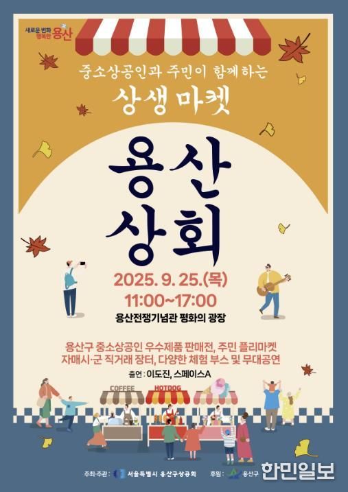 한민일보 서울포커스 김서윤 기자 | 서울 용산구가 오는 25일 오전 11시~오후 5시 전쟁기념관(이태원로 29) 평화의 광장에서 (사)용산구상공회 주최로 열리는 중소상공인과 주민이 함께하는 상생마켓 ‘용산상회’를 후원한다.