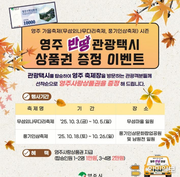 한민일보 서울포커스 김봉순 기자 | 가을 빛으로 물드는 10월, 영주시는 여름 축제에 이어 가을 축제 시즌에도 ‘영주 반띵관광택시’를 이용해 축제장을 찾는 관광객에게 최대 2만 원 상당의 영주사랑상품권을 증정하는 이벤트를 진행한다고 23일 밝혔다.