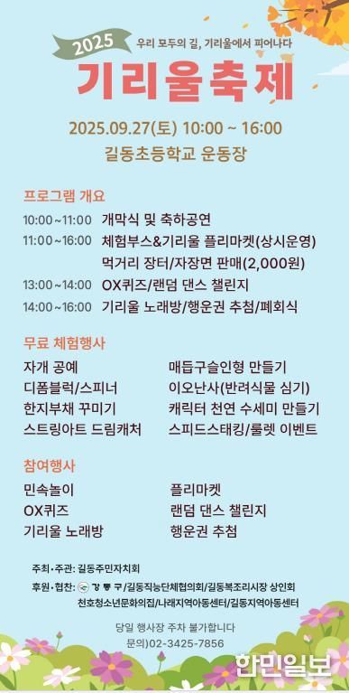 한민일보 서울포커스 박정민 기자 | 강동구 길동은 오는 27일 10시부터 16시까지 길동초등학교 운동장에서 주민 화합을 위한 ‘2025 기리울 축제’가 열린다고 밝혔다.
