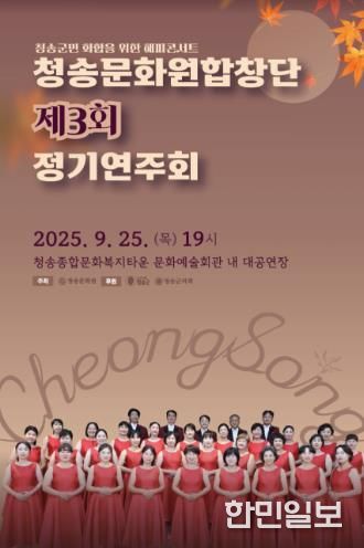한민일보 서울포커스 김봉순 기자 | 청송군은 오는 9월 25일 목요일 오후 7:00부터 청송문화예술회관 대공연장에서‘청송문화원합창단 제3회 정기연주회’를 개최한다고 밝혔다.