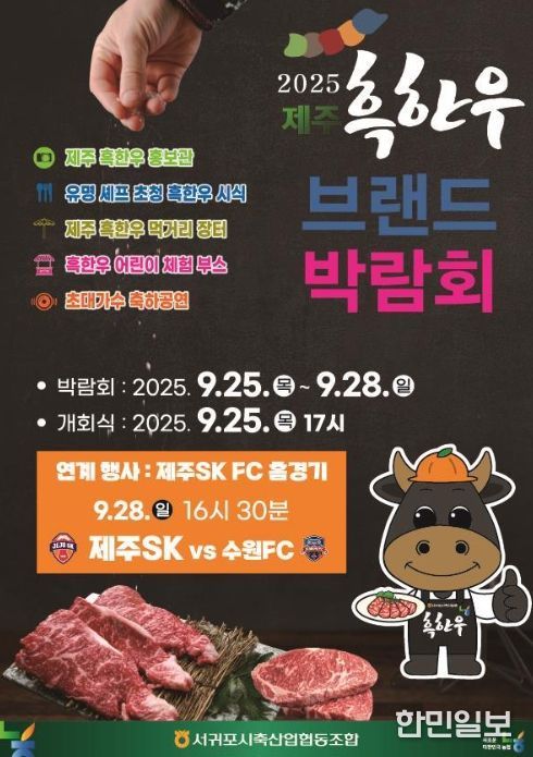 한민일보 서울포커스 김다남 기자 | 서귀포시는 추석 명절을 앞두고 제주 흑한우의 가치를 널리 알리고, 소비촉진을 통해 지역 축산업과 경제 활성화에 기여하고자 오는 9월 25일부터 9월 28일까지 4일간 제주월드컵경기장 광장에서 ‘2025 제주 흑한우 브랜드 박람회’를 개최한다고 밝혔다.