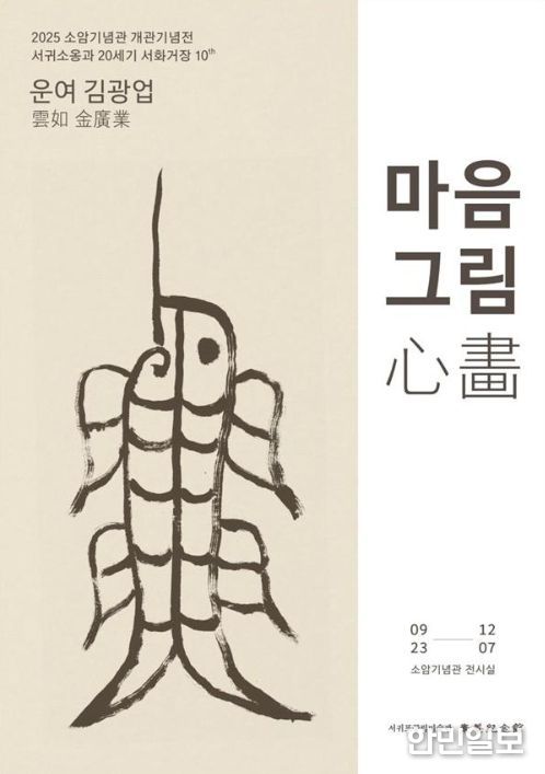 한민일보 서울포커스 김다남 기자 | 서귀포공립미술관 소암기념관에서는 ‘서귀소옹과 서화거장’ 열 번째 전시로 서예가 운여 김광업(雲如 金廣業, 1906~1976)의 예술세계를 조명하는《운여 김광업, 마음그림心畵》을 오는 9월 23일부터 12월 7일까지 전시한다고 밝혔다.
