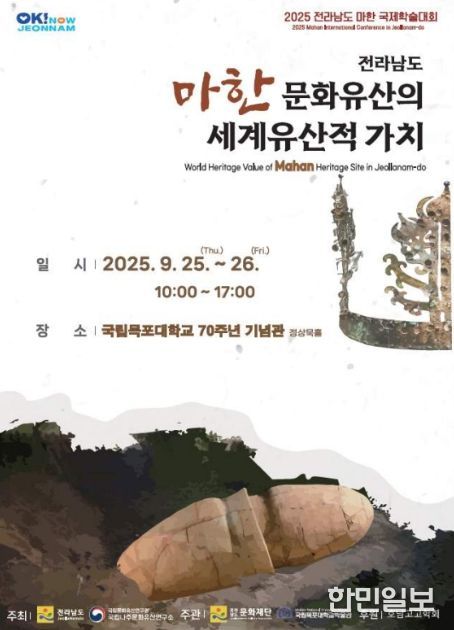한민일보 서울포커스 박용남 기자 | 국가유산청 국립문화유산연구원 국립나주문화유산연구소는 전라남도와 함께 9월 25일부터 26일까지 국립목포대학교 70주년 기념관(전남 무안군)에서 '전라남도 마한 문화유산의 세계유산적 가치'를 주제로 국제학술대회를 개최한다.