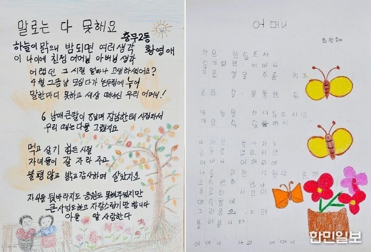 황영애 어르신의 수상작 ‘말로는 다 못해요’는 늦은 밤 친정 어머니와 아버지를 떠올리며 느낀 애틋한 감정과 건강하게 자란 자식들을 자랑스러워하는 마음을 담았다.