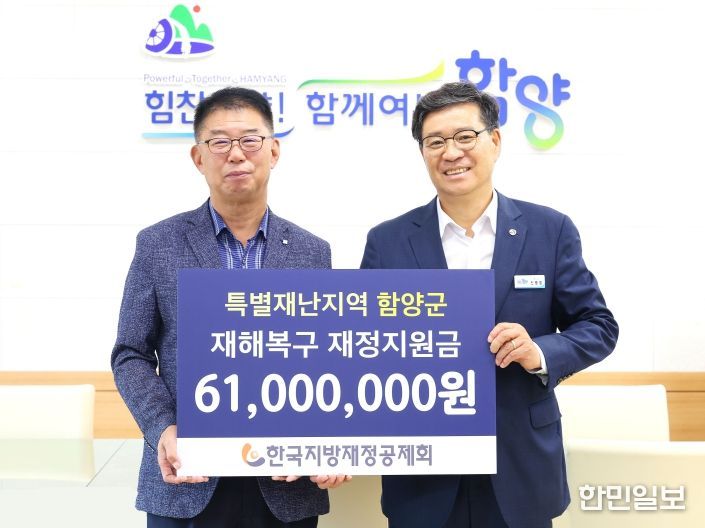 한민일보 서울포커스 김서윤 기자 | 함양군은 22일 행정안전부 산하 지방재정 전문기관인 한국지방재정공제회(이사장 정선용)로부터 특별재난지역 재해복구 재정지원금 6,100만 원을 전달받았다.