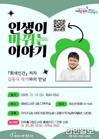 한민일보 서울포커스 백진욱 기자 | 인천 미추홀구 용비도서관은 오는 10월 19일 청소년을 위한 특별한 북콘서트 ‘인생이 바뀌는 이야기’를 개최한다.