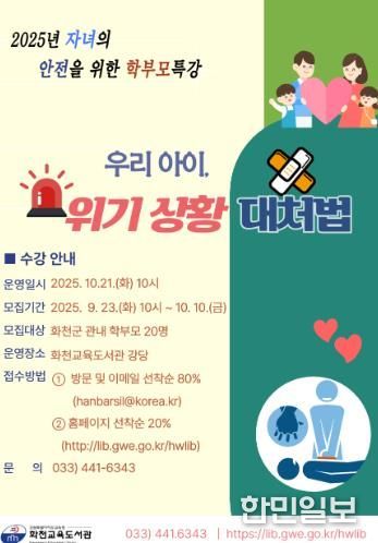 한민일보 서울포커스 곽중희 기자 | 화천교육도서관은 10월 21일 10시, 화천군 관내 학부모를 대상으로 학부모 소통(疏通) 프로그램 ‘우리 아이, 위기 상황 대처’ 특강을 운영한다.