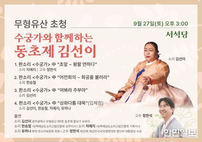 한민일보 서울포커스 박용남 기자 | 광주문화재단 전통문화관은 오는 9월 27일 오후 3시, 토요상설공연 20회차 무대에서 광주광역시 무형유산 제1호 동초제 흥보가 보유자 김선이 명창과 차세대 소리꾼들이 함께하는 특별한 판소리 무대를 선보인다.
