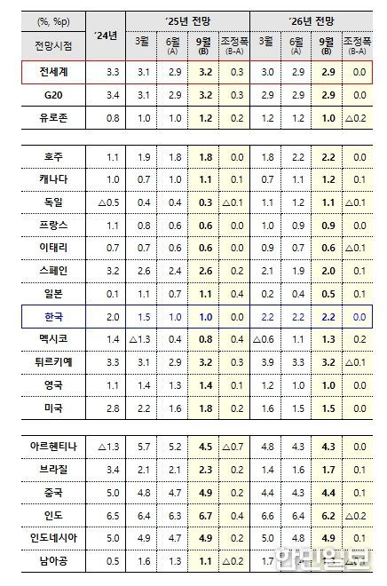 경제협력개발기구는 한국경제의 경우 최근 회복세가 지속될 것으로 예상하며 ’25년 1.0%(’25.6월 전망과 동일), ’26년 2.2%(’25.6월 전망과 동일) 성장을 전망했다. 주요국의 경우 내년이 올해보다 대체로 성장이 둔화되는 것으로 전망하는 데 반해 한국의 경우 최근 회복세가 지속되며 내년 성장률이 올해보다 크게 높은 것이 특징이다. 물가상승률은 ’25년 2.2%(’25.6월 전망 대비 +0.1%p), ’26년 1.9%(’25.6월 전망 대비 △0.1%p)로 전망했다.