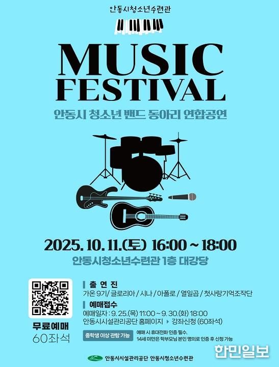 한민일보 서울포커스 김봉순 기자 | 안동시시설관리공단에서 운영하는 안동시청소년수련관이 '2025 안동시 청소년 밴드 동아리 연합공연 ‘뮤직 페스티벌’'을 오는 10월 11일 청소년수련관 대강당에서 개최한다고 밝혔다.