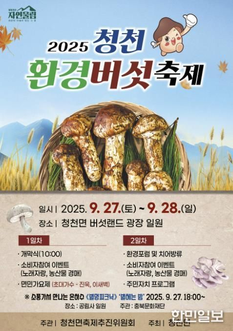 한민일보 서울포커스 김다남 기자 | 충북 괴산군 청천면의 대표 지역축제인 ‘2025 청천환경버섯축제’가 오는 27일부터 28일까지 이틀간 청천 버섯랜드 광장 일원에서 열린다.