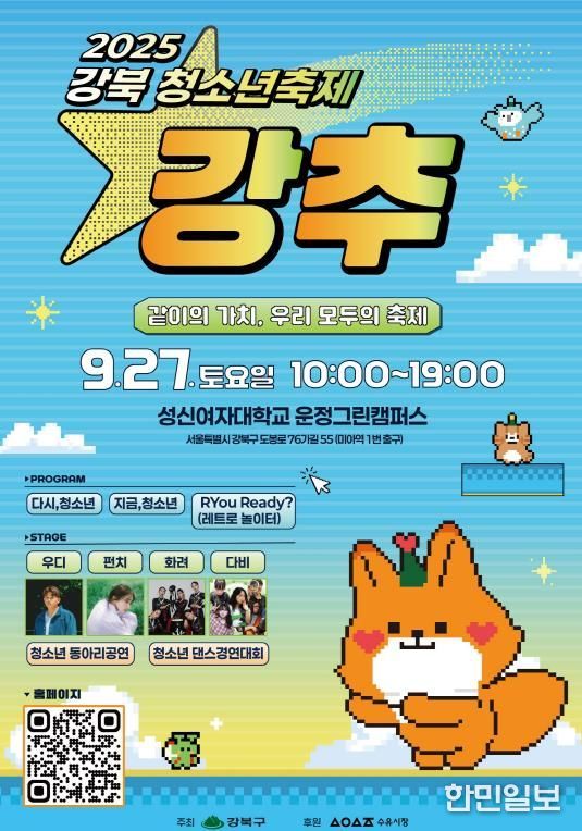 한민일보 서울포커스 김봉순 기자 | 서울 강북구는 오는 9월 27일 오전 10시부터 오후 7시까지 성신여자대학교 미아운정그린 캠퍼스 광장에서 ‘2025 강북 청소년축제 강추’를 개최한다.