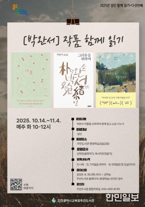 한민일보 서울포커스 유창렬 기자 | 인천광역시교육청주안도서관은 10월 14일부터 11월 4일까지 운영하는 ‘2025년 성인 함께 읽기-'박완서 작품 함께 읽기'’ 프로그램 참여자를 모집한다.