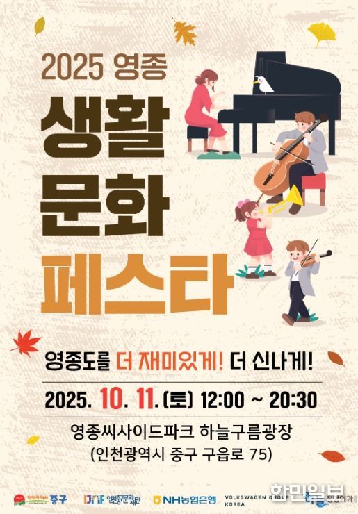 한민일보 서울포커스 김다남 기자 | (재)인천중구문화재단은 오는 10월 11일 영종씨사이드파크 하늘구름광장(인천 중구 구읍로 75)에서 ‘2025 영종 생활문화 페스타’를 개최한다고 밝혔다.