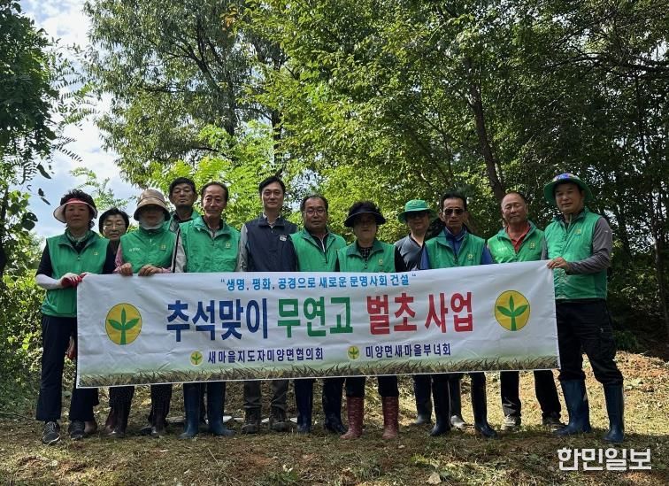 한민일보 서울포커스 임경복 기자 | 지난 9월 23일, 미양면 새마을지도자·부녀회 임원 11명이 함께 무연분묘(보체리 산58) 예초 작업을 실시했다.