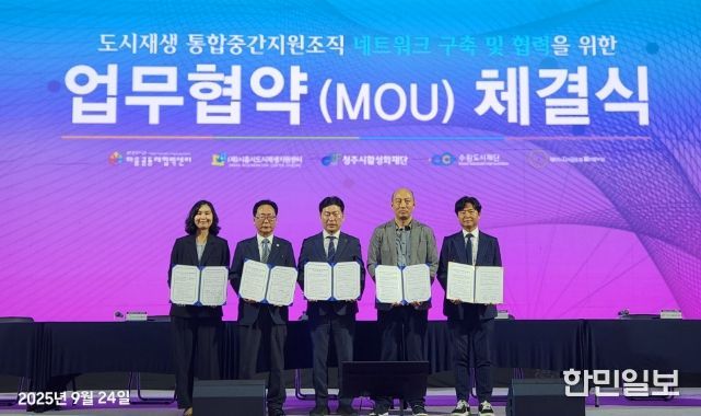 한민일보 서울포커스 김다남 기자 | 청주시활성화재단은 24일 삼척시에서 열린 ‘2025 대한민국 도시․지역혁신 산업박람회’ 개막식 식전행사에서 도시재생 협력체계 구축과 지속가능한 도시재생 전략 및 협력방안 모색을 위한 다자간 도시재생 거버넌스 업무협약을 체결했다.
