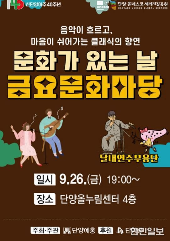 한민일보 서울포커스 김다남 기자 | 충북 단양군은 오는 9월 26일부터 12월까지 매월 마지막 금요일 저녁, 올누림센터 4층 강당에서 ‘2025 문화가 있는 주간 금요문화마당’을 운영한다고 밝혔다.