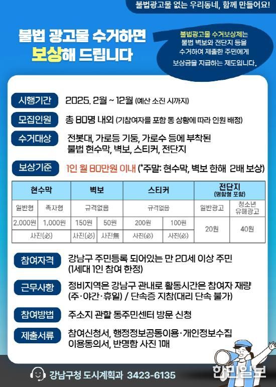 보상금은 월 최대 80만 원 한도에서 현수막 1장당 1,000~2,000원, 벽보 50~150원, 스티커 100~200원, 전단지 20~40원이 지급된다. 주말에는 현수막과 벽보에 한해 평일의 2배 금액이 적용된다. 정비는 강남구 관내에서 이뤄지며, 활동 시간은 개인 일정에 맞춰 탄력적으로 운영된다.