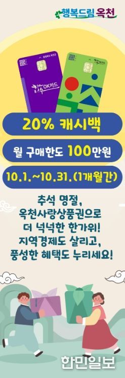 한민일보 서울포커스 김다남 기자 | 옥천군이 추석 명절을 맞아 군민 소비 촉진과 지역경제 활성화를 위해 오는 10월 한 달간 향수OK카드(옥천사랑상품권)의 캐시백 혜택을 기존 15%에서 20%로 상향 지원한다.