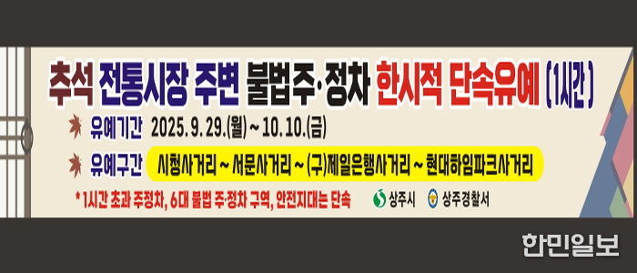 한민일보 서울포커스 김봉순 기자 | 상주시는 민족 고유의 명절인 추석을 맞아 전통시장 활성화와 귀성객들의 편의를 위해 전통시장 주변 불법주·정차 단속을 한시적으로 유예한다.