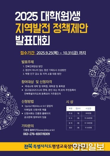 한민일보 서울포커스 박용남 기자 | 전북특별자치도평생교육장학진흥원은 지역 발전에 대한 청년들의 관심과 참여를 높이기 위해 '2025년 대학(원)생 지역발전 정책제안 발표대회'를 개최한다고 24일 밝혔다.