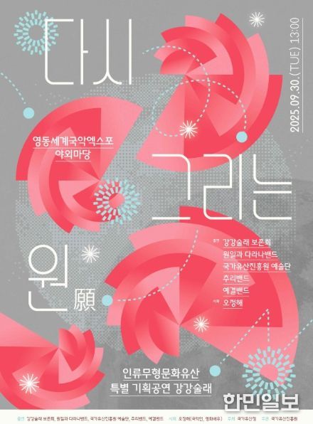 한민일보 서울포커스 박용남 기자 | 국가유산청은 국가유산진흥원과 함께 9월 30일 오후 1시 충북 영동 세계국악엑스포 야외마당과 10월 8일~9일 오후 8시 15분 서울 경복궁 집옥재, 향원정 무대에서 유네스코 인류무형유산 강강술래 특별 기획공연을 개최한다.