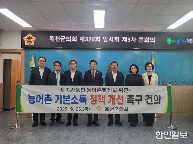 한민일보 서울포커스 김다남 기자 | 옥천군의회는 지난 25일 열린 제326회 임시회 제3차 본회의에서 송윤섭 의원이 대표발의한 '농어촌 기본소득 정책 개선 촉구 건의안'을 채택했다고 밝혔다.