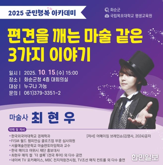 한민일보 서울포커스 박용남 기자 | 화순군은 오는 10월 15일 수요일 오후 3시, 화순군청 4층 대회의실에서 '2025 군민행복 아카데미 8회차 강연을 개최한다고 밝혔다.