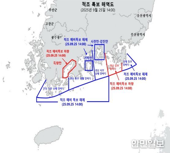 한민일보 서울포커스 진광성 기자 | 해양수산부는 9월 25일 16시부로 적조 위기경보 단계를 ‘경계’에서 ‘주의’로 하향 조정한다고 밝혔다.