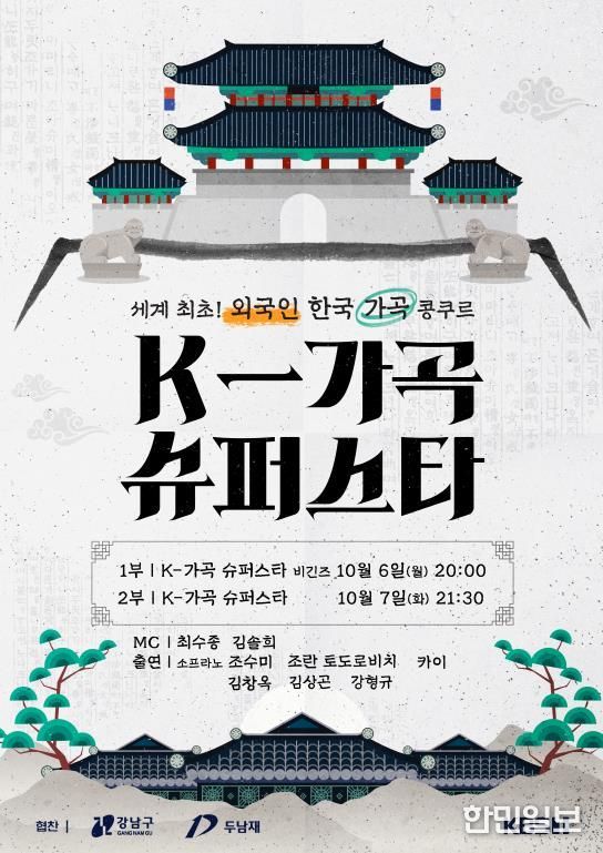 한민일보 서울포커스 박정민 기자 | 꿈이 모이는 도시, 미래를 그리는 강남구가 개청 50주년을 맞아 한국 가곡의 아름다움을 세계 무대에 알리는 글로벌 경연 'K-가곡 슈퍼스타'를 후원한다. 이번 행사는 오는 9월 30일 오후 7시 여의도 KBS홀에서 열리며, 전 세계 11개국 13명의 외국인 성악가가 무대에 올라 한국 가곡을 선보인다.