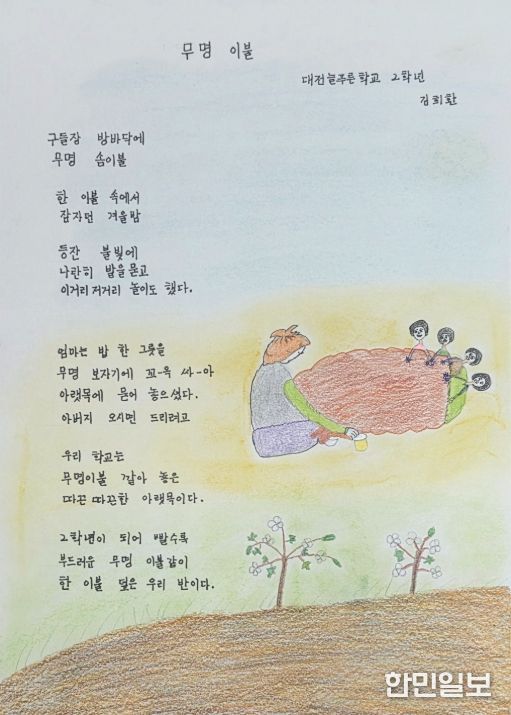 전국 시화전은 ‘문해, 세상이 달라 보여요’라는 주제로 열렸으며, 성인 문해 학습자들이 글을 배우며 경험한 일상의 변화와 감정을 진솔하게 담아냈다. 수상작 '무명 이불'은 과거 가족과의 따뜻한 기억을 떠올리며, 현재 배움터에서 느끼는 정서적 감정을 부드럽고 따뜻한 문장으로 풀어낸 작품이다.