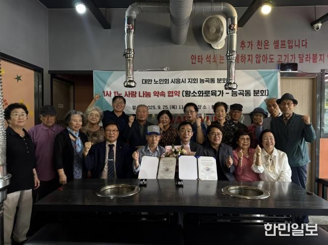 한민일보 서울포커스 유현민 기자 | 대한노인회 시흥시지회 능곡동분회와 황소화로육가 능곡직영점이 지난 9월 25일 능곡동 경로당 이용 어르신들의 복지 증진과 건강한 지역사회 조성을 위한 상호 협력 협약을 체결했다. 이날 협약식에는 김연규 대한노인회 시흥시지회장 등 30여 명이 참석했다.