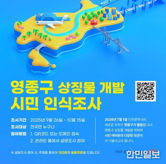 한민일보 서울포커스 김다남 기자 | 인천시 중구는 인천형 행정 체제 개편에 따라 2026년 7월 1일 공식 출범을 앞둔 ‘영종구’의 정체성과 미래 비전을 담은 ‘상징물(CI, 캐릭터)’ 개발에 본격 돌입했다고 26일 밝혔다.