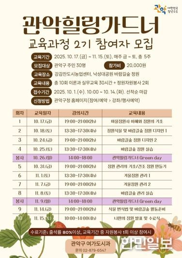 한민일보 서울포커스 곽중희 기자 | 관악구가 주민이 행복한 힐링·정원 도시 조성을 위해 마을 정원사 ‘관악 힐링 가드너’ 2기 교육생을 모집한다.