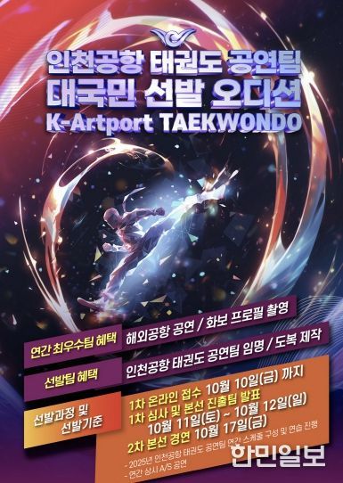 한민일보 서울포커스 최성훈 기자 | 인천국제공항공사는 인천공항에서 진행되는 태권도 상설공연인 ‘2025-2026 인천공항 태권도 상설공연’에 참여할 태권도 전문 공연팀을 공개 모집한다고 28일 밝혔다.