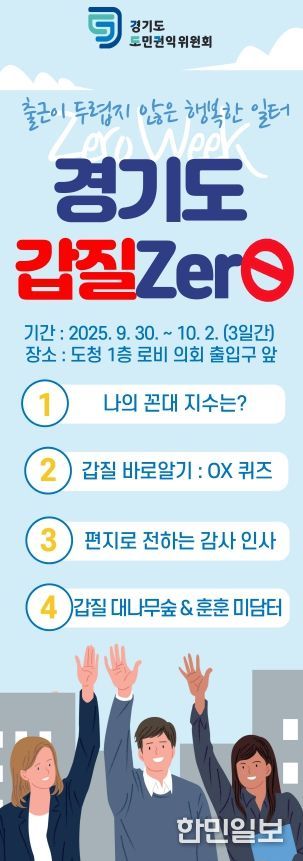 한민일보 서울포커스 김윤이 기자 | 경기도 도민권익위원회는 9월 29일부터 10월 2일까지 ‘경기도 갑질 제로(Zero) 홍보주간’을 지정해 갑질 근절과 건강한 직장문화 조성을 위한 다양한 캠페인과 교육 프로그램을 추진한다.