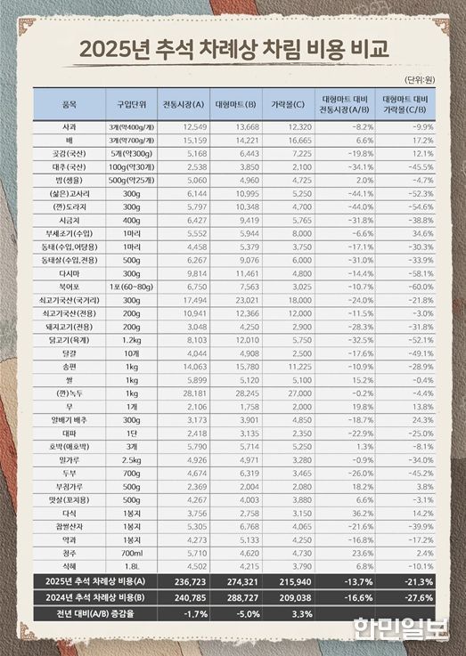 한민일보 서울포커스 국용호 기자 | 서울시농수산식품공사는 추석 명절 장보기에 도움이 되는 정보를 시민에게 제공하고자 서울시 내 대형마트, 전통시장, 가락시장(가락몰) 총 25곳을 대상으로 진행한 ‘추석 차례상 차림 비용’ 조사 결과를 발표했다.