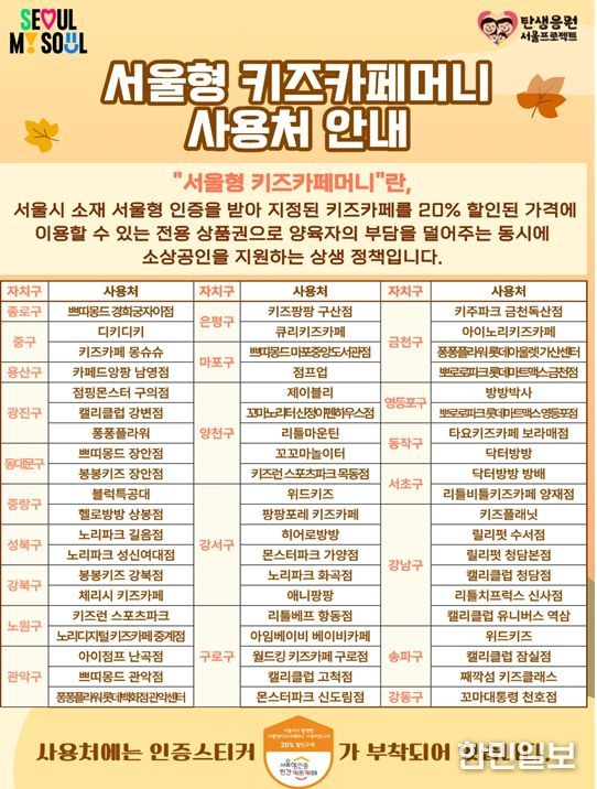 한민일보 서울포커스 국용호 기자 | 열흘 안팎의 긴 추석연휴를 앞두고 아이들과 양육자가 보다 부담 없는 가격으로 키즈카페에서 즐거운 연휴를 보낼 수 있도록 서울시가 20% 할인 혜택이 있는 ‘서울형 키즈카페머니’ 11억 원을 추가 발행한다고 밝혔다.