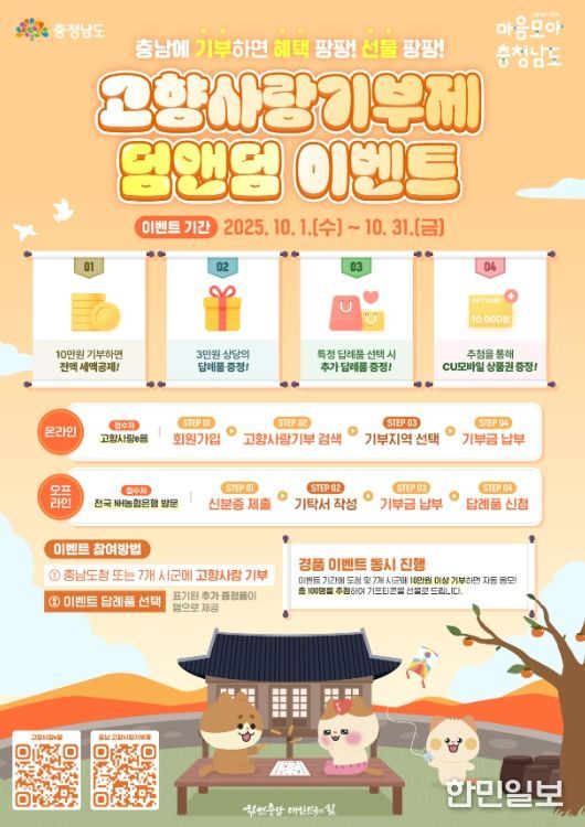 한민일보 서울포커스 박덕환 기자 | 충남도는 천안·공주·보령·금산·서천·청양·예산 7개 시군과 10월 한 달간 ‘추석맞이 고향사랑 덤앤덤 이벤트’를 실시한다고 29일 밝혔다.