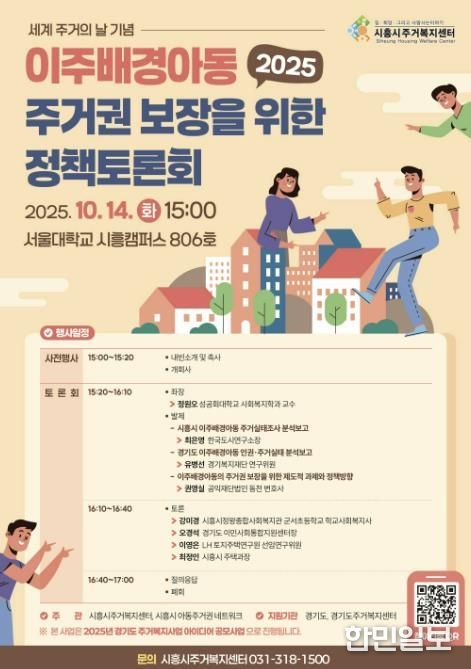 한민일보 서울포커스 유현민 기자 | 시흥시주거복지센터는 오는 10월 14일 오후 3시, 서울대학교 시흥캠퍼스 806호에서 ‘이주배경아동 주거권 보장을 위한 정책토론회’를 개최한다.