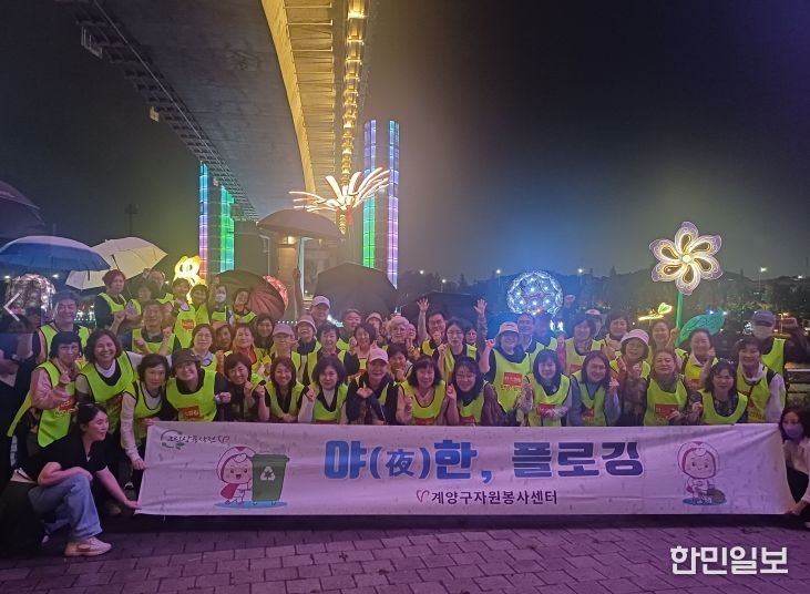 한민일보 서울포커스 김성혜 기자 | 인천 계양구자원봉사센터는 지난 24일 저녁, ‘계양아라온 아트웨이(빛의 거리 3단계)’와 ‘가을꽃 국화축제’가 열리는 현장에서 자원봉사자 74명과 함께 ‘야(夜)한 플로깅’ 봉사활동을 진행했다.