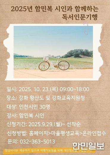 한민일보 서울포커스 유창렬 기자 | 인천광역시교육청신트리도서관은 10월 23일 인천시민을 대상으로 ‘함민복 시인과 함께하는 독서인문기행’을 운영한다.