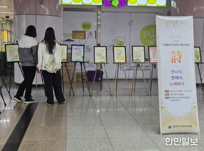한민일보 서울포커스 유한희 기자 | 대전서부교육지원청은 9월 29일부터 10월 17일까지 대전시청역 대합실(대전 서구 둔산중로 55)에서 2025학년도 사제동행 독서문학기행 참가자 28명의 시화 작품 전시회 '詩-만나다. 반하다. 노래하다.'