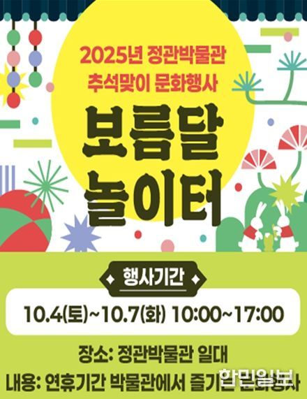 한민일보 서울포커스 임광현 기자 | 정관박물관은 다가오는 추석을 맞아 특별 문화행사 '보름달 놀이터'를 오는 10월 4일부터 10월 7일까지 개최한다고 밝혔다.