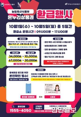 한민일보 서울포커스 김용택 기자 | 군산시가 추석을 앞두고 장바구니 물가 부담을 덜기 위해 농림축산식품부·해양수산부가 주관하는 ‘농축·수산물 온누리상품권 환급행사’를 오는 10월 1일부터 5일까지 진행한다.