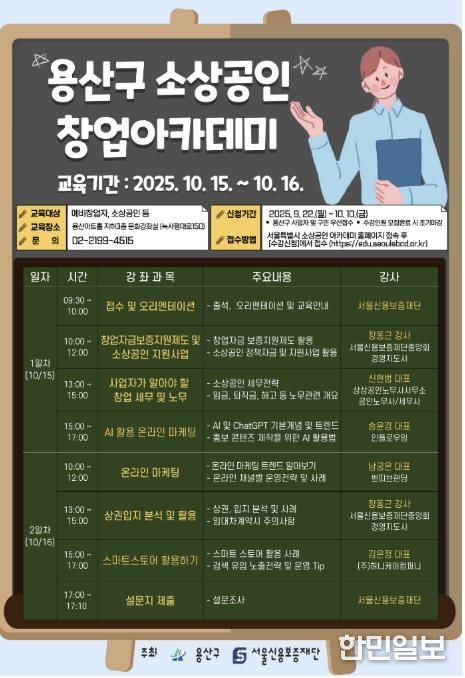 한민일보 서울포커스 김서윤 기자 | 서울 용산구가 서울신용보증재단과 함께 예비창업자와 소상공인의 성공적인 창업 지원을 위한 ‘2025 하반기 창업아카데미’를 개최한다.