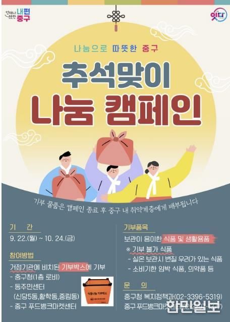 한민일보 서울포커스 김서윤 기자 | 서울 중구가 다가오는 추석 명절을 앞두고 어려운 이웃을 돕기 위해 '2025 추석맞이 나눔 캠페인'을 진행한다. 이번 캠페인은 지난 22일부터 오는 10월 24일까지 4주간 이어지며, 주민들의 따뜻한 동참으로 풍성한 명절 나눔을 실천할 예정이다.
